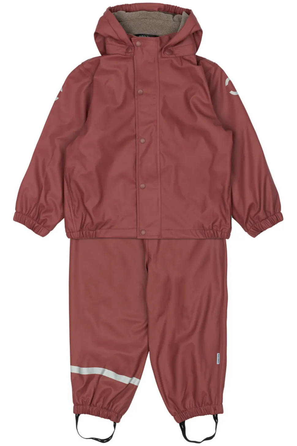 Praktisk og funktionelt recycled regnsæt fra mikk-line, der holder dit barn tørt. Regntøjet er udstyret med refleksdetaljer så dit barn kan færdes sikkert i mørket. Regnsættet er naturligvis både vand- og vindtæt. Sømmene er svejsede, hvilket forhindrer vand i at trænge igennem samlingerne. Buksen har fodstropper, som holder buksen under gummistøvlen. Regnbukserne har justerbare talje.