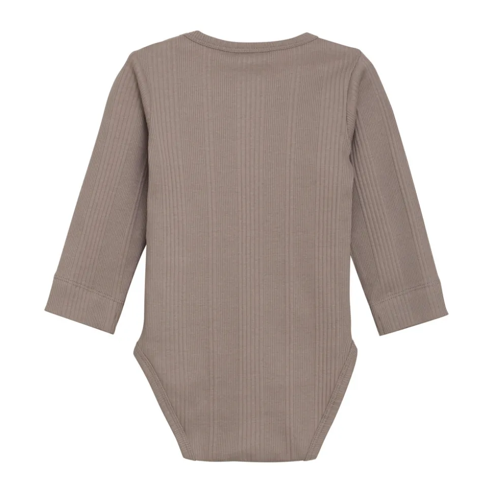 Klassisk body fra EN FANT i rib og ensfarvet design. Bodyen er fremstillet i en blød bomuldskvalitet, der føles behagelig mod huden og giver god komfort hele dagen. Den har lange ærmer, en rund halsudskæring og lukkes praktisk med trykknapper mellem benene – ideel til både hverdag og leg.