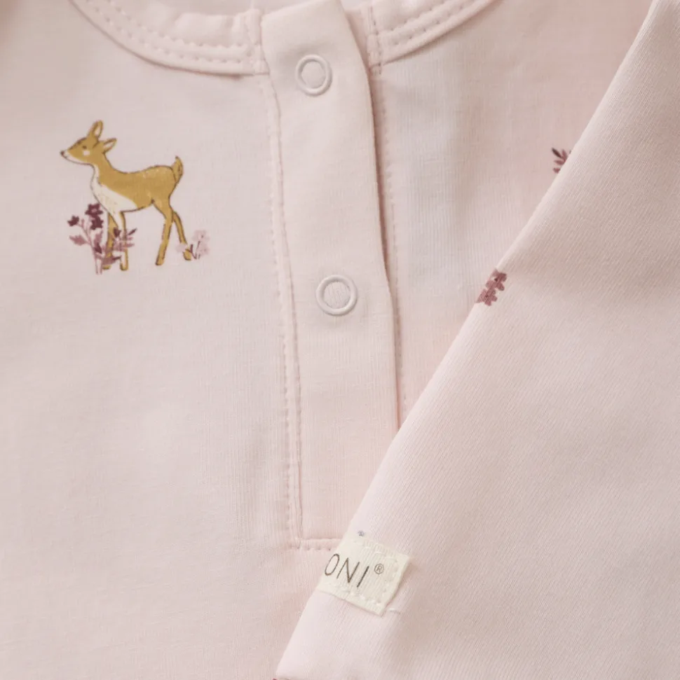 Heldragt med fødder og all-over-print fra FIXONI. Denne heldragt er designet med praktiske trykknapper foran og mellem benene, hvilket gør den nem at tage af og på – ideel til både hverdag og nattetid.