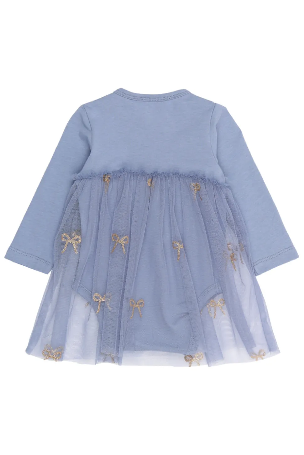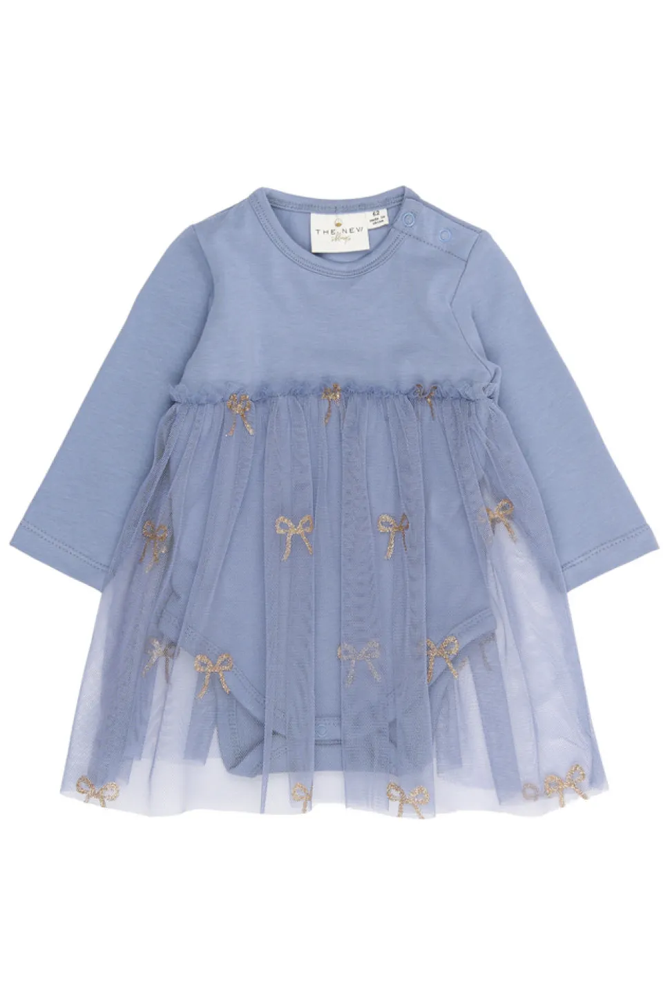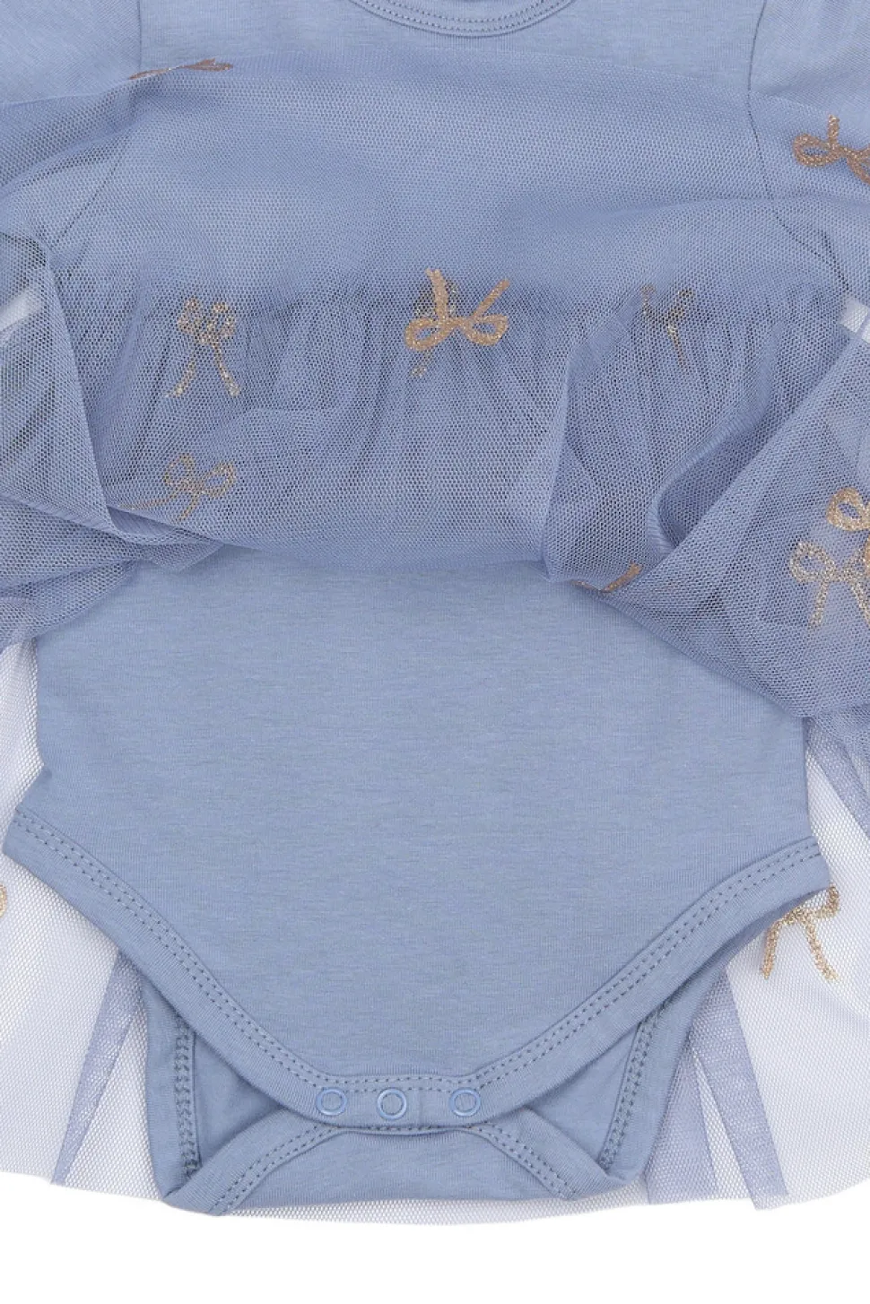 Denne bodysuitkjole fra THE NEW Siblings kombinerer komfort og elegance i ét yndigt design. Toppen har lange ærmer og en blød bodysuit med trykknapper, mens bunden er prydet med et lag tyl broderet med små sløjfer, hvilket skaber et festligt og feminint look. Perfekt til særlige lejligheder, men alligevel behageligt nok til hverdagsbrug.