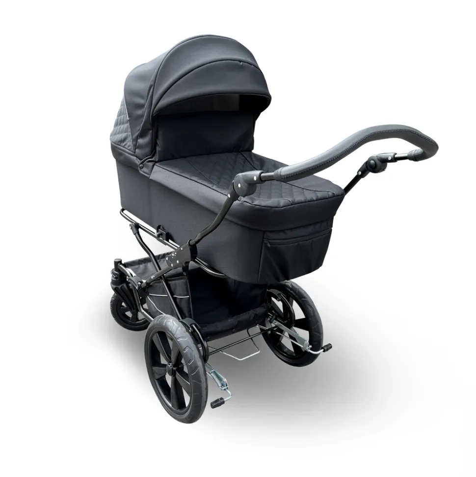 Stellet er med justerbart styr, som er producret i faux leather materiale. Alle hjul er punkterfri EVA skum hjul, og de to forhjul kan fastlåses hvis dette ønskes – det gør kørsel på ujævnt underlag mere komfortabelt. Barnevognen har fuld rammedækning, som giver optimal understøtning af barnevognsoverdelen, og gør barnevognen mere robust. Vippeled på stellet giver en god blød affjedring, som sikrer stabil kørsel på alle underlag. Barnevognens varekurv er fremstillet i slidstærk stof, og den er dyb og rummelig. På dette stel er der en god fodbremse, så der kan opnås optimal sikkerhed, i forbindelse med at barnevognen står bremset.