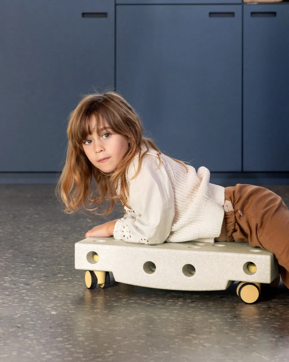 MODU Rullebrættet er et enkelt og alsidigt aktivitetslegetøj til grundlæggende motorisk træning med babyer og små børn. Læg dit barn på maven og sus rundt på gulvet, eller fjern hjulene og vip frem og tilbage. Selv små bevægelser og sanseindtryk kan bringe smilet frem hos små børn — og det bliver kun sjovere! Som dit barn vokser, kan det suse og snurre sig selv rundt helt uden hjælp fra mor og far. Fjern hjulene og brug brættet til balancetræning, eller byg det om til en gyngehest eller lille gåbil ved at tilføje andre MODU-klodser.