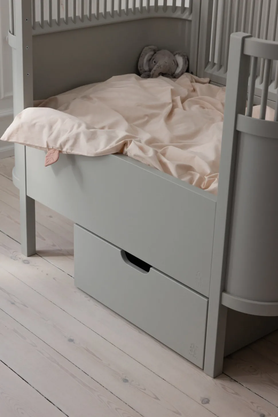 Sebra Sengeskuffen, Baby & Jr. passer til Sebra Sengen, Baby & Jr. Sebra Sengeskuffen, Baby & Jr. er udstyret med hjul, så den er let at skubbe ind under og trække ud fra sengen. Et afrundet, udskåret håndtag midt på skuffen gør den samtidig nem at tage fat i. Når Sebra Sengen, Baby & Jr. er trukket ud som juniorseng, kan der være to skuffer under sengen. Brug Sebra Sengeskuffen til opbevaring af legetøj, sengetøj, tøj eller hvad der nu måtte være behov for. Møblet kommer usamlet og samles let ved at følge den tilhørende samlevejledning.