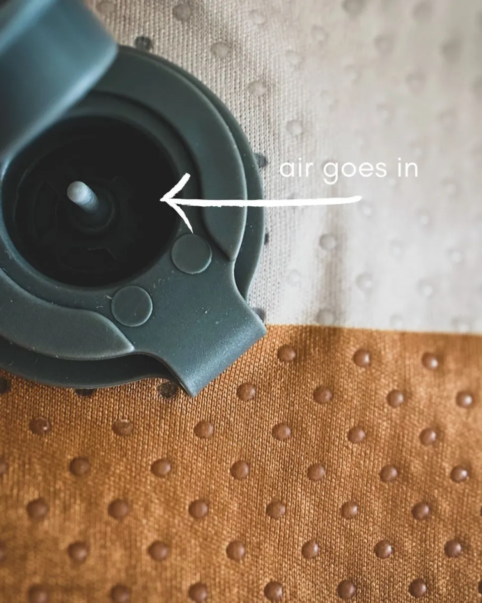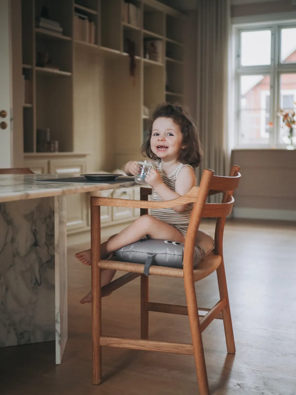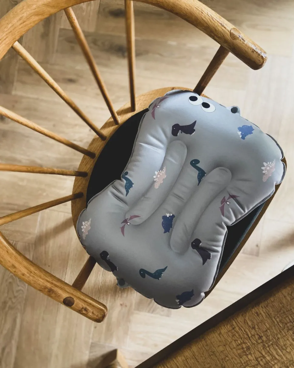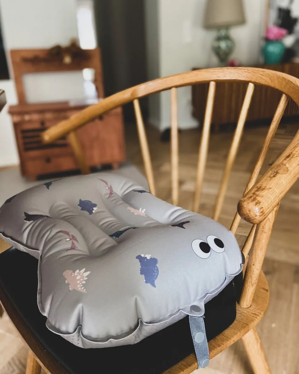 Oppustelig siddepude til barnet, der er for stort til højstolen og for lille til en spisestol.