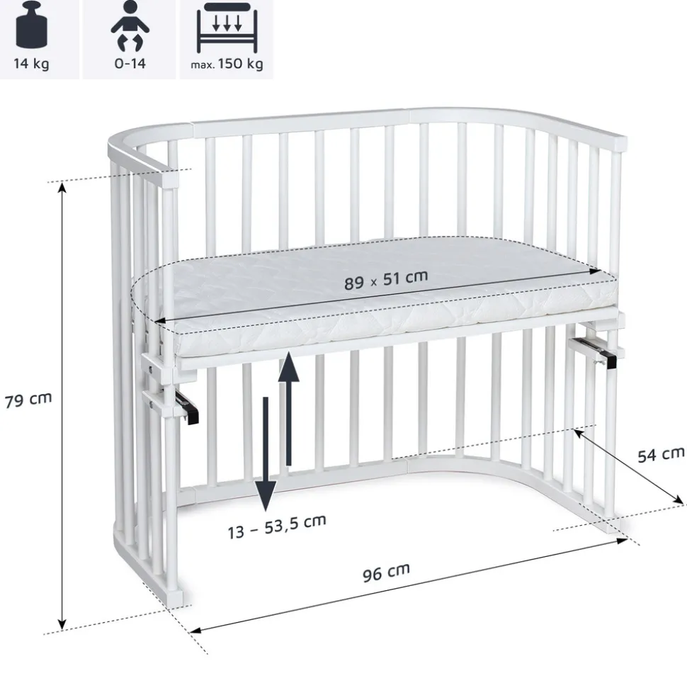På grund af sin solide konstruktion kan bedside crib’en bære belastninger på op til 150 kg og kan derfor modstå belastningen fra en voksen.