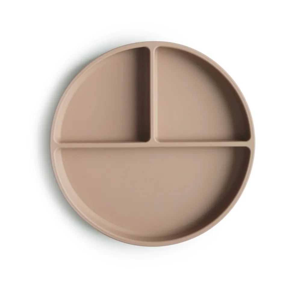 Mushie tallerken med skridsikker bund. Tallerken i silikone med sugekop i bunden, hvilket sikrer, at tallerkenen ikke rykker sig, når baby spiser sin mad. Den er opdelt i tre, så det er muligt at opdele maden. Tallerkenen har en god størrelse, og den klæber godt fast på en ren, glat og tør overflade med god friktion. Kombinér tallerkenen med Mushies andre produkter til spisetid for at skabe et fuldent og elegant sæt.
