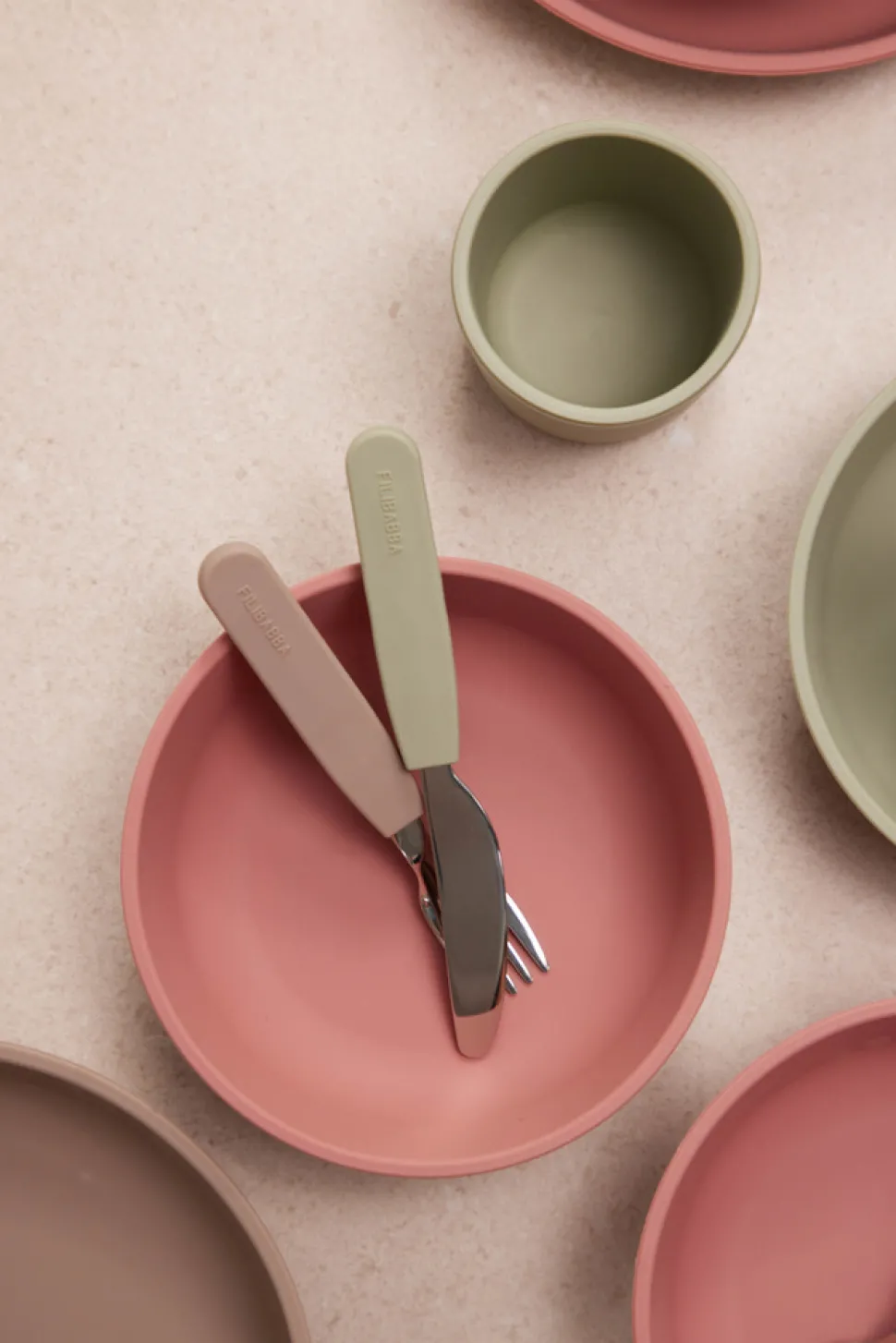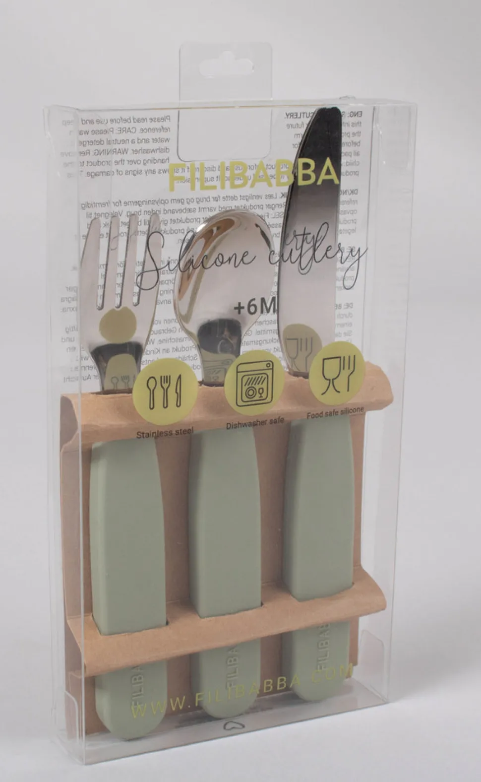 Silikone bestiksæt til børn med ske, gaffel og kniv. Silikonehåndtaget giver et godt greb til små hænder, hvilket gør det nemmere for barnet at lære teknikken med at holde på bestikket og spise selv. Efter spisetid rengøres bestikket nemt i opvaskemaskinen. Børnebestikket er lavet af 100% rustfrit stål med silikonehåndtag. Materialet er superblødt fødevaregodkendt silikone, som naturligvis er 100% fri for BPA og phthalater. Silikone er et meget slidstærkt materiale og vil ikke revne eller knække som plastik, så dette bestik vil give mange timers hyggelige måltider.