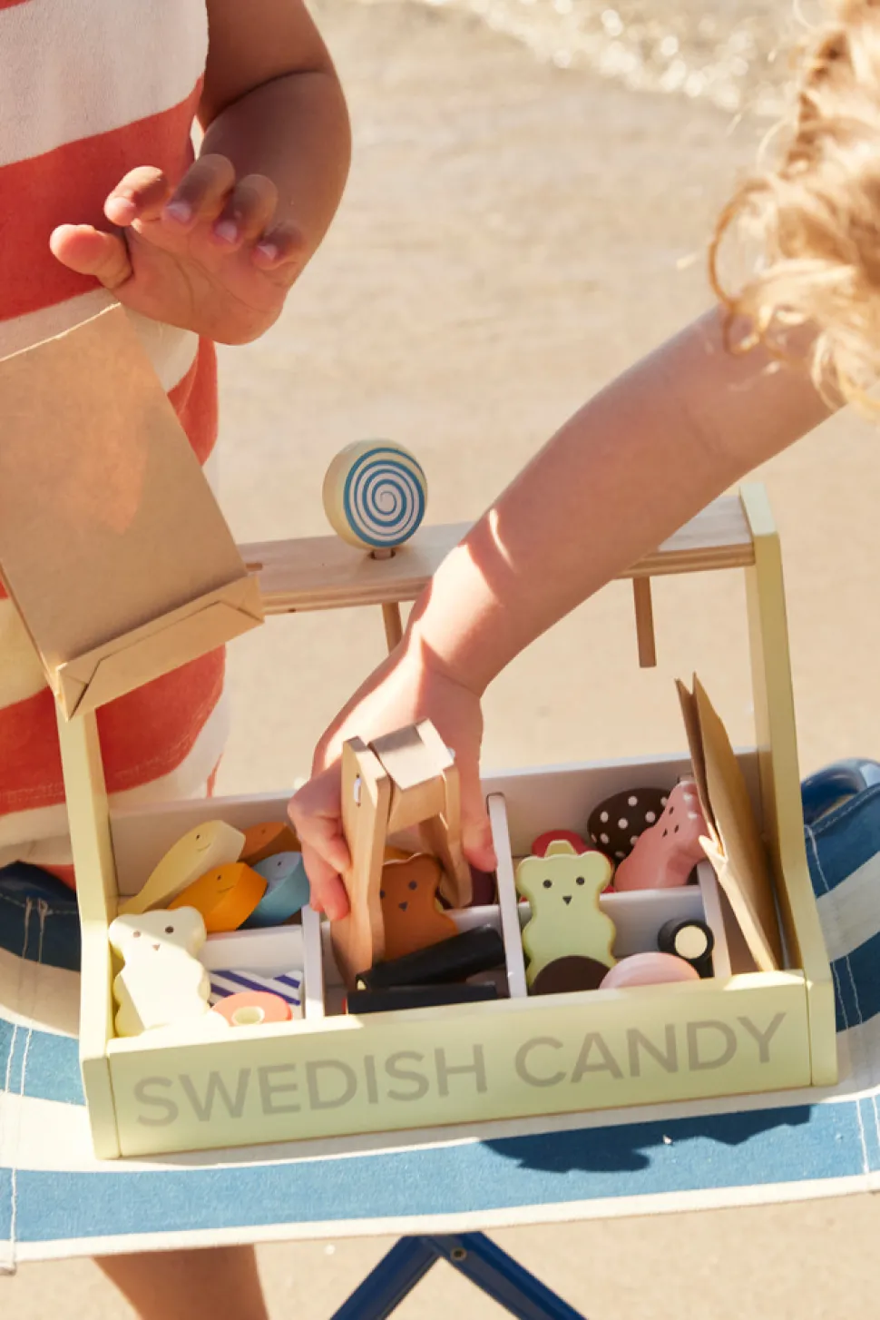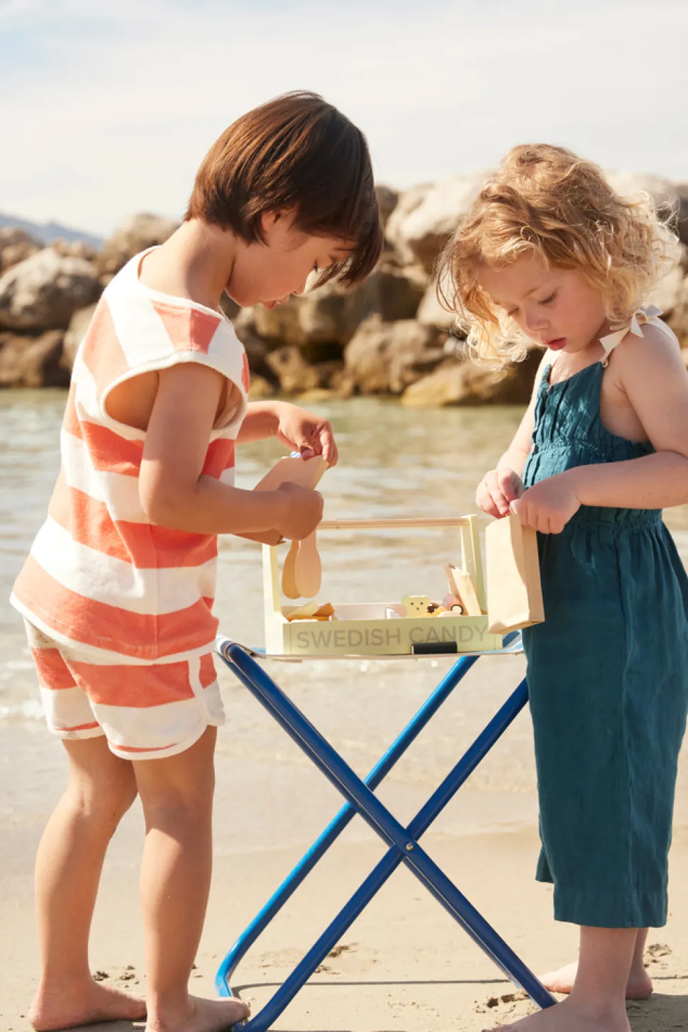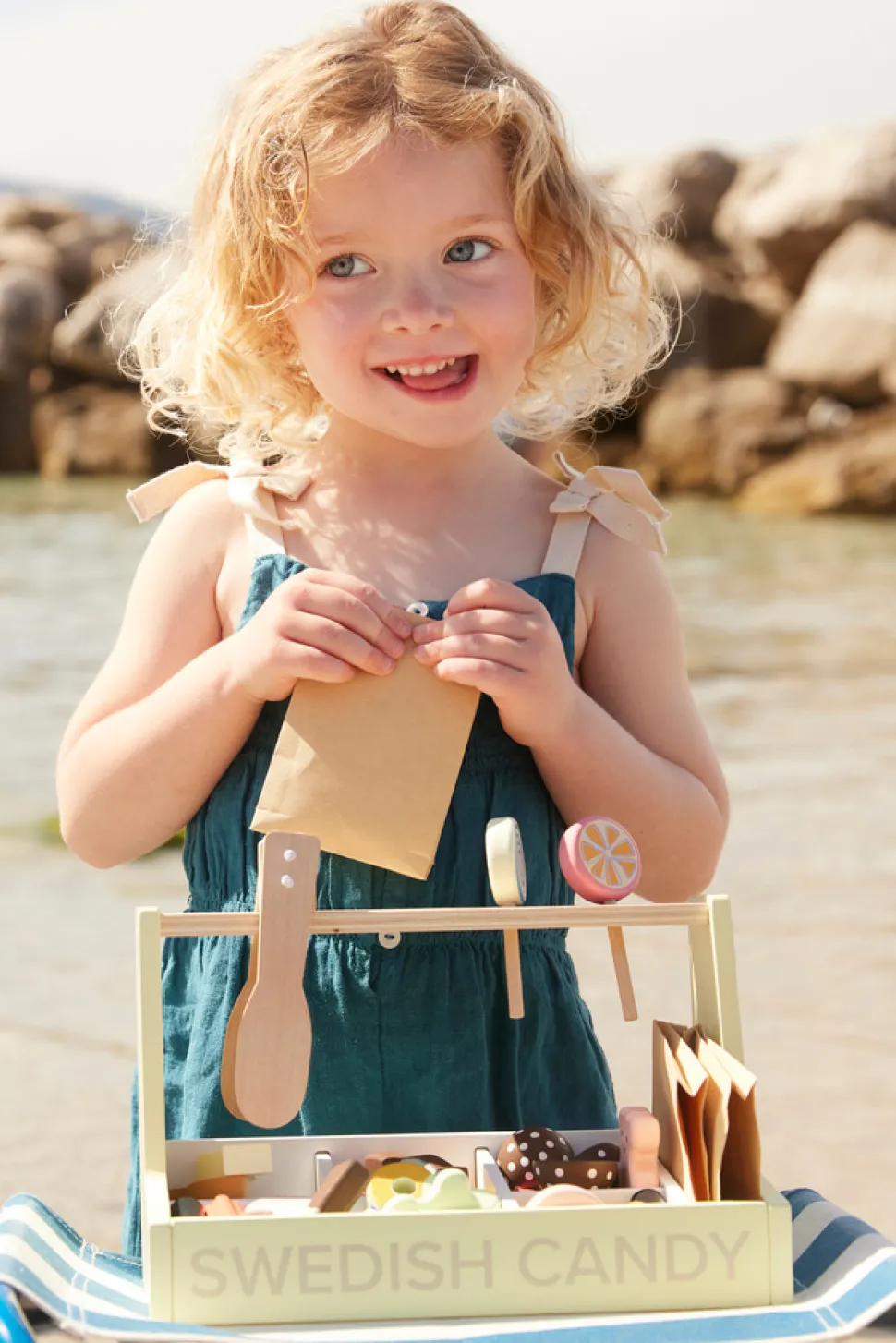 Vi elsker slik! Slikbutikken er nu åben for alle børn med en sød tand. Den er fyldt med lækkerier som vingummibamser, skumsvampe, colaflasker, romkugler, seje kirsebær og slikkepinde – alt sammen lavet i træ! Glem ikke de populære saltlakridsstænger, som passer perfekt sammen med hindbærstænger – en super kombi! Lørdagsslik, fødselsdag eller bare en helt almindelig eftermiddag – sliktid er altid noget at glæde sig til. Med både stærke og milde smage er der noget for enhver smag. Sættet indeholder et slikkestativ, en slik-tang, tre papirposer, tre slikkepinde og forskellige stykker træslik. Den medfølgende tang hjælper børn med at øve deres finmotorik, når de leger butik og sælger slik – en sjov og lærerig leg, helt som i en rigtig slikbutik!