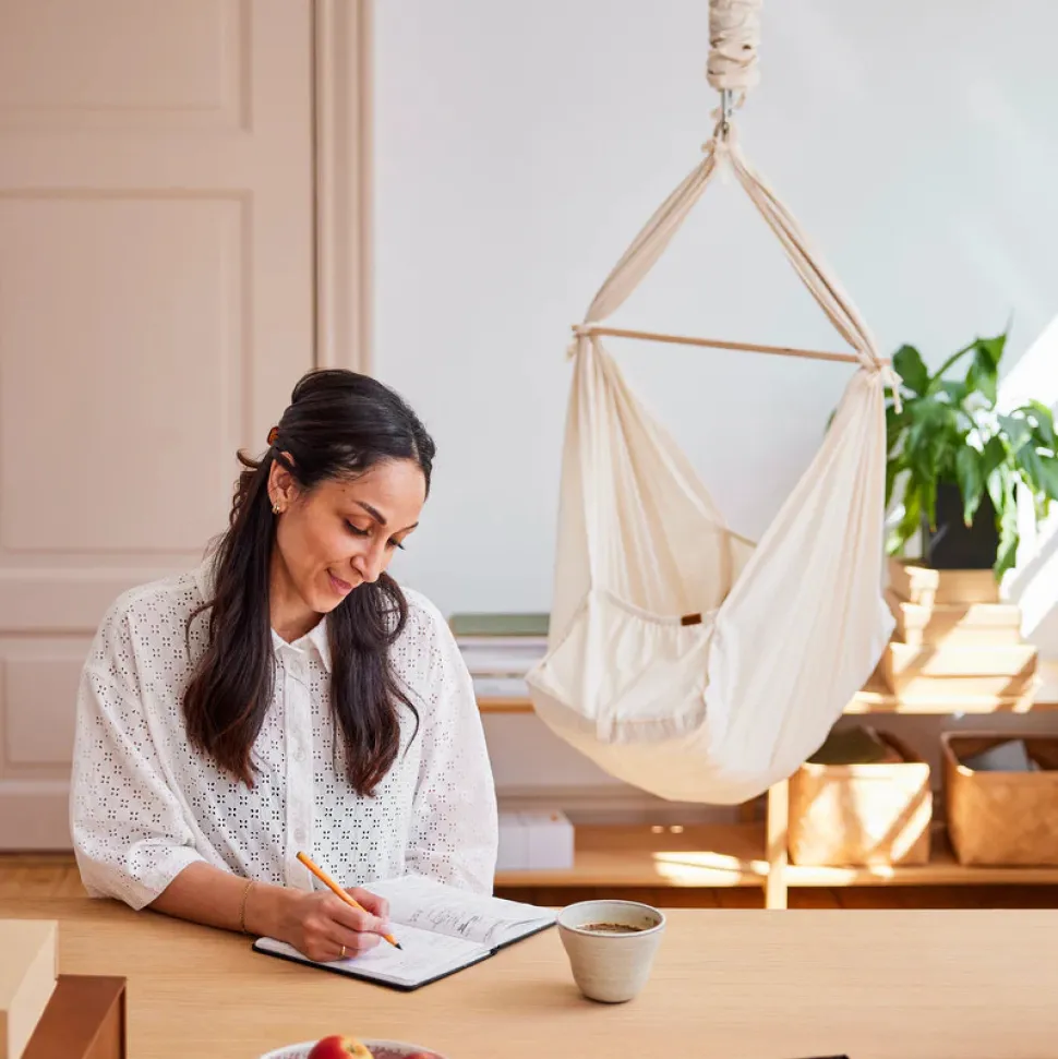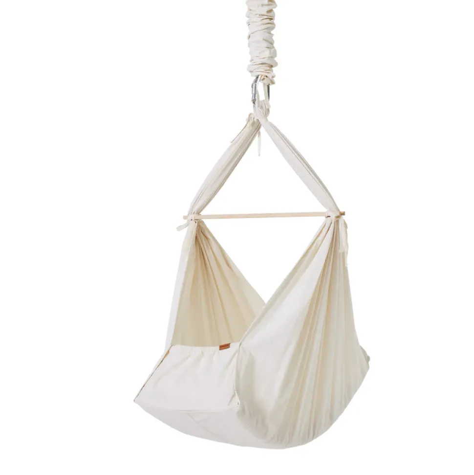 Blød og slidstærk slyngevugge i 100% økologisk bomuld, hvor der medfølger en blød madrads med polyester fyld. Slyngevuggen efterligner forældrenes trygge favn og bløde bevægelser og former sig om barnets krop. Den er perfekt til urolige babyer eller babyer, der sover relativt korte lure. Du kan placere den stort set, hvor du ønsker det, og du kan endda tage den med til bedsteforældre, venner eller i mødregruppen – blot du har det rette tilbehør. Slyngevuggen kommer i en økologisk bomuldsstofpose, som gøre den nem at transportere. Yderligere medfølger der en fjedre med sikkerhedsstrop og en tværpind i ubehandlet bøgetræ, som giver et skandinavisk udtryk.