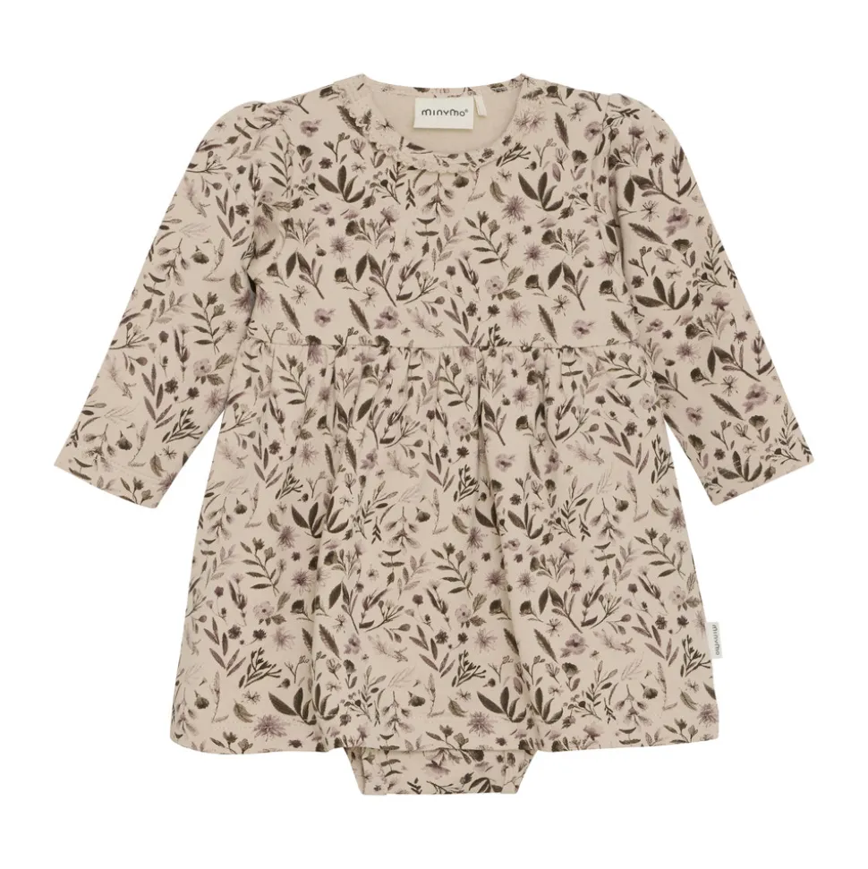 Denne langærmede kjole fra Minymo er dekoreret med et smukt, blomstret all-over print, der giver et sødt og feminint udtryk. Kjolen har en indbygget body med praktiske trykknapper, som gør den nem at tage af og på – perfekt til aktive småbørn.