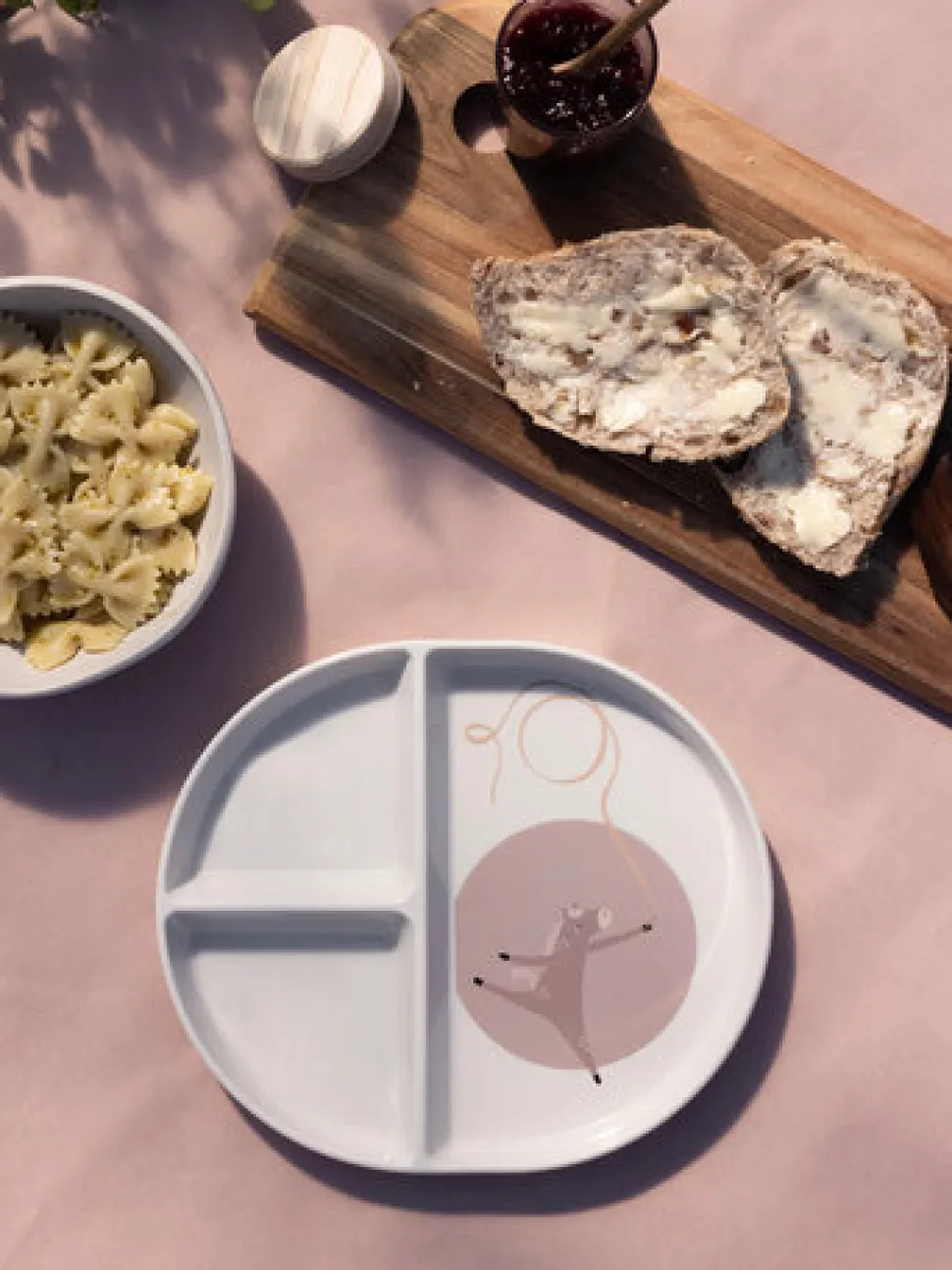 Pakken består af tallerken m/3 rum, skål, kop og låg!