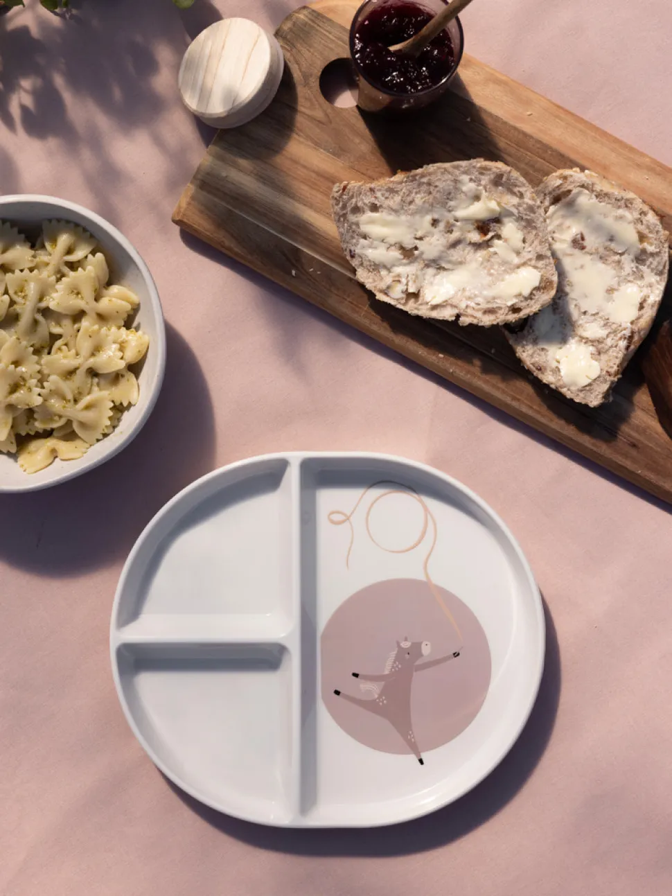 Flot ruminddelt tallerken med tre rum, der har motiver fra Sebras tema Teeny Toes – en fortælling om glæden ved at bruge kroppen og udtrykke sig gennem hop, dans og leg uanset forudsætninger.