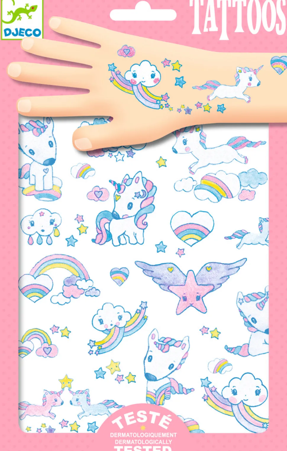 Flotte tatoveringer fra Djeco. Pakken indeholder 2 ark med en masse skønne tatoveringer, lige til at klippe ud og duppe på huden, med en opvredet klud.