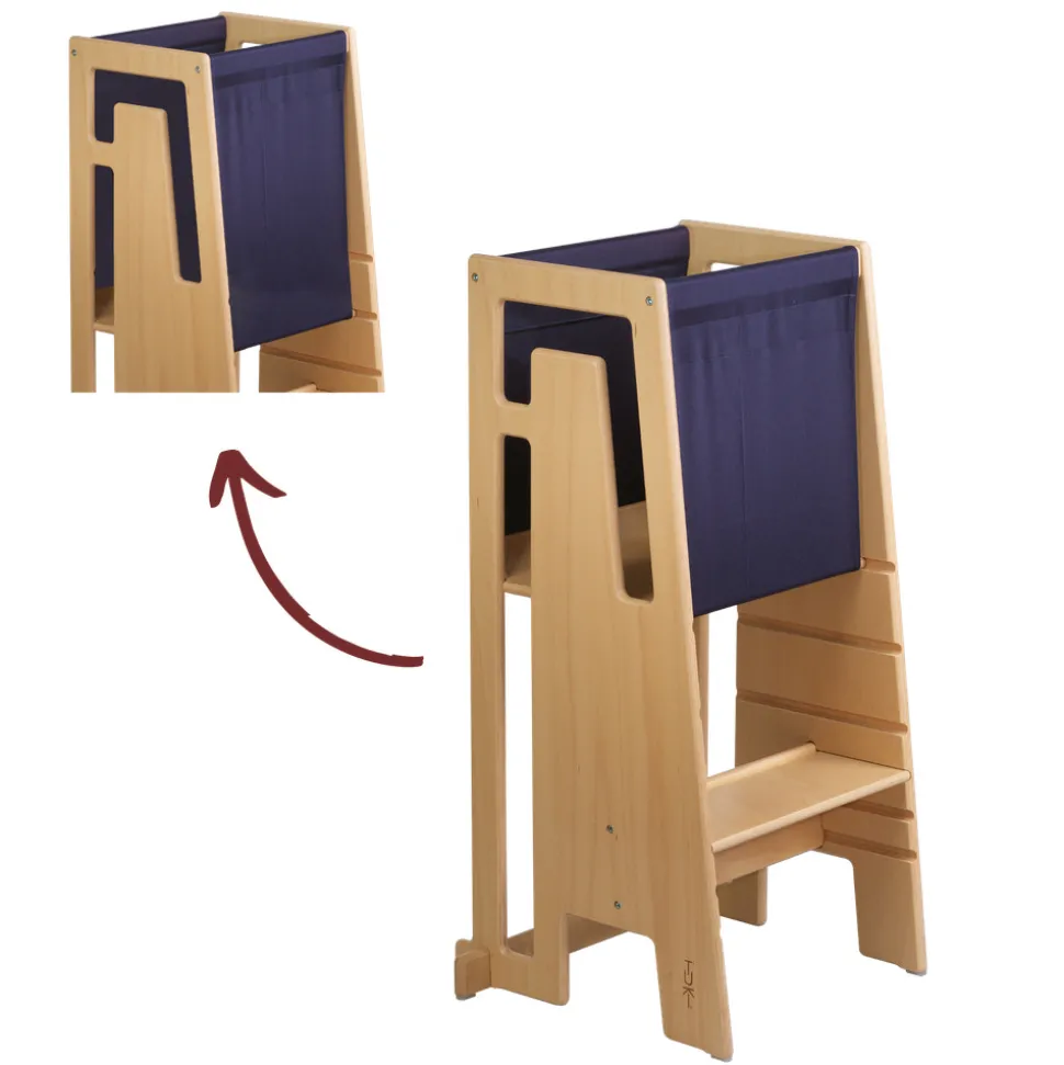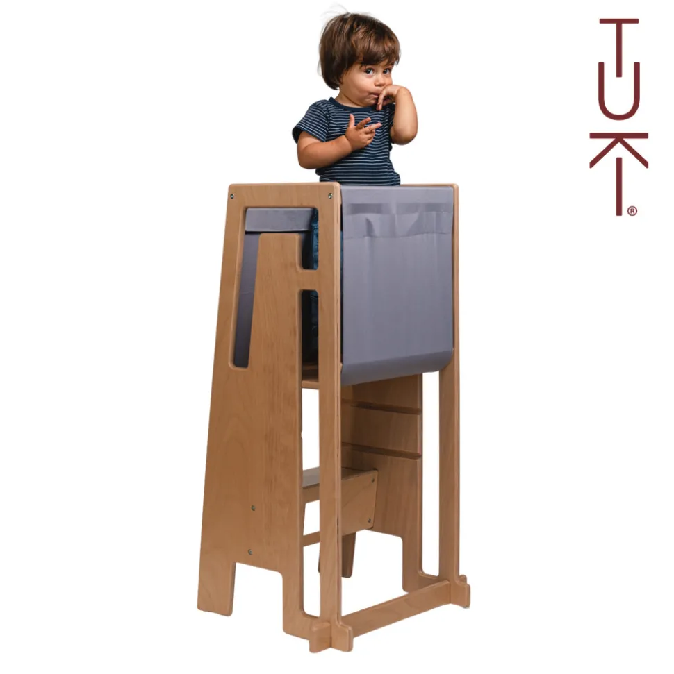 Til de yngste opdagelsesrejsende har Tuki fundet på noget helt særligt – Tuki tekstil. Tuki læringstårnet i kombination med den farverige bomuldsklud af høj kvalitet bringer meget små børn, der allerede kan stå sikkert i øjenhøjde med voksne. Således er brugen af læringstårnet nu endnu sikrere. Det robuste stof i ét stykke fastgøres af velcrolukningen på ingen tid og forhindrer mindre børn i at glide igennem. Tuki tekstilet kan kun bruges, så længe ståbrættet er i det øverste trin. Kan vaskes på 40°