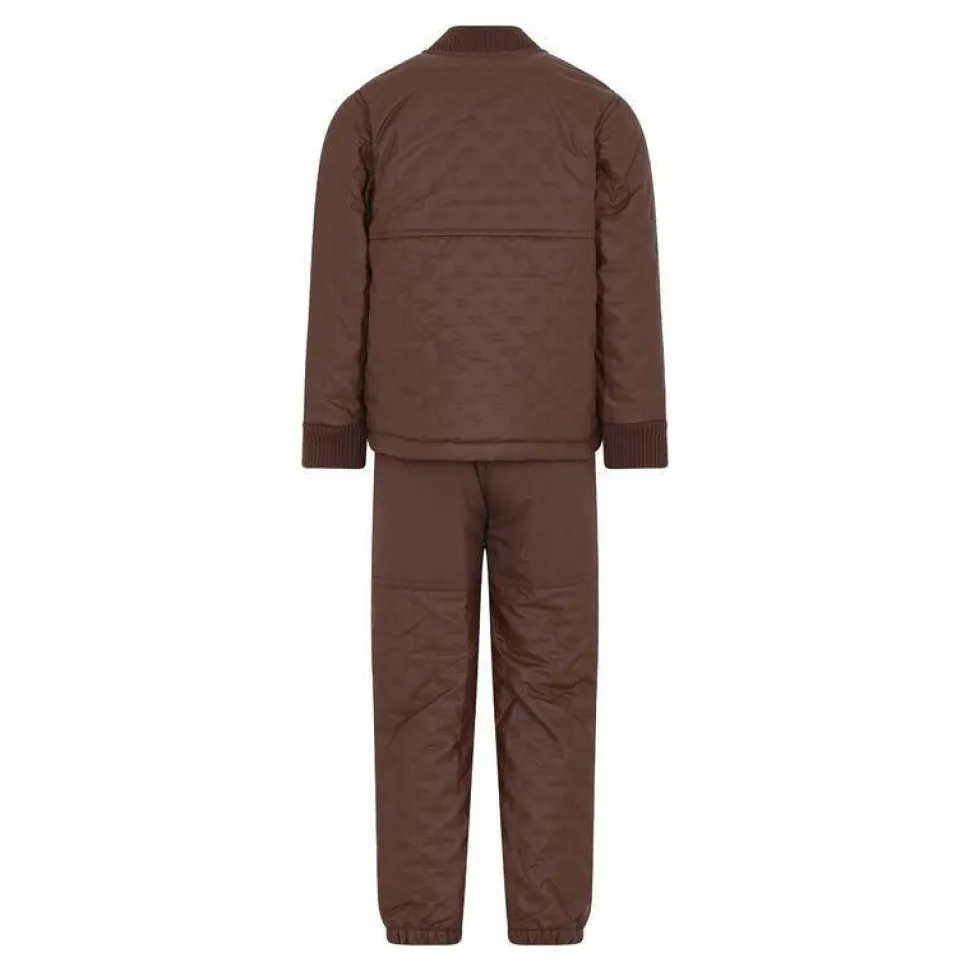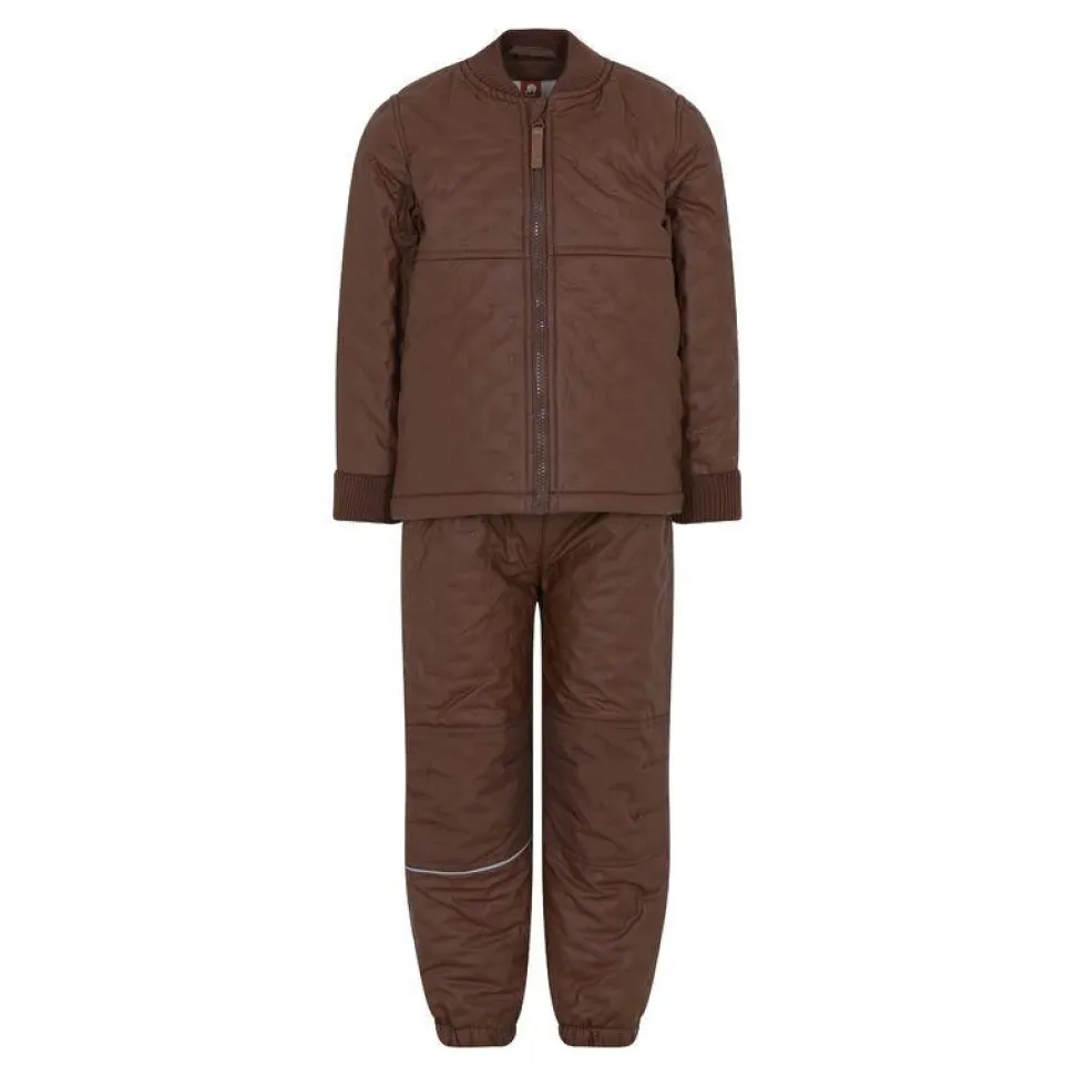 Termotøj med PU-belægning, som gør termotøjet vandtæt. Derudover er sættet foret indvendigt. Ekstra forstærket på knæ og bagpå på bukserne. Bukserne har desuden elastik i talje og ved ankler. Jakken har ribkant ved hals og håndled samt lynlåslukning. CeLaVi-logo foran.