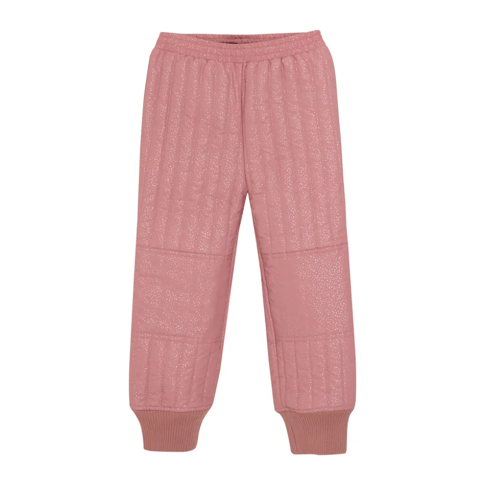 Termo sæt fra EN FANT med flot glitter design. Sættet består af en termojakke og termobukser i samme farve. Termojakken åbnes med kvalitetslynlås foran. Jakken har flæse på skuldrene og ned langs ærmernes på skæring foran og bagpå. Jakken har brede ribkanter i ærmerne med et praktisk hul til tommelfingeren. Jakken har lommer i siderne og refleksdetaljer bagpå. Jakken er lidt længere bagpå end foran. Termobukserne har elastikkant i taljen, som kan strammes sammen med en elastiksnøre på indersiden. Ved anklerne er der brede ribkanter.