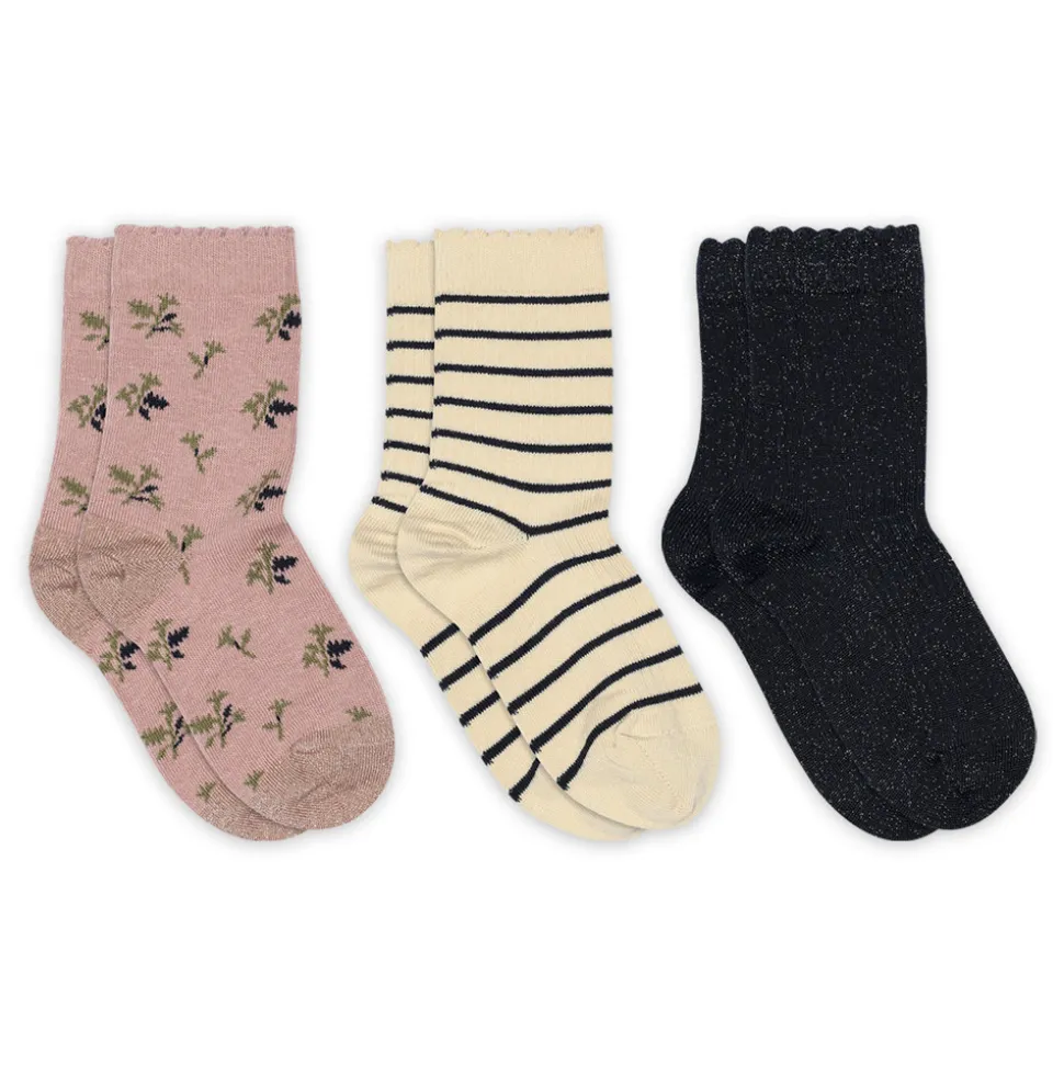 3-pak med søde og flotte strømper fra mpKids. Strømperne har glimmerdetaljer forskellige steder, og et par er strikket i glimmer over det hele. Fælles for dem alle er blød og behagelig bomuld, som holder længe og er dejlig at have på. Perfekte at have på med et par sneakers.