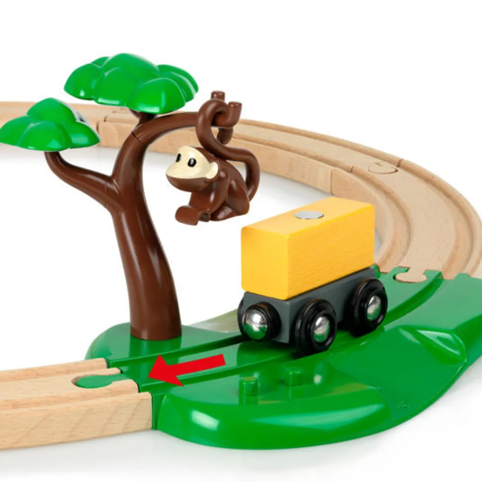 Tag med på safari og se om du kan få øje på zebraen ude på savannen. Men pas på den frække abe, der elsker at stjæle den magnetiske mad fra toget, når du kører forbi. Indeholder en safari ranger figur og et lokomotiv, der fragter godset, dyr og skinner. I alt 17 dele.