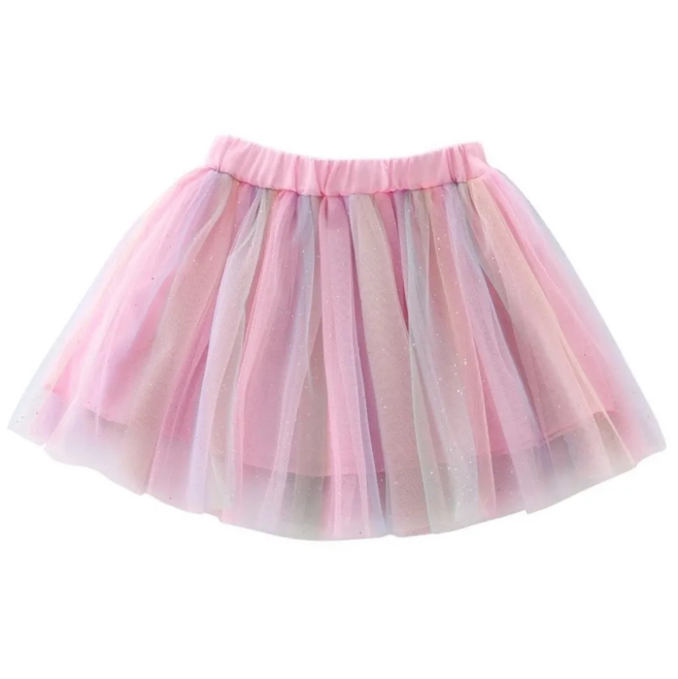 Et blødt tylskørt i de fineste pastelstriber med et glimt af glitter. Det svæver let og leger med farverne som en lille regnbue, der gør dans og fantasi endnu mere magisk. Perfekt til både leg og fest.