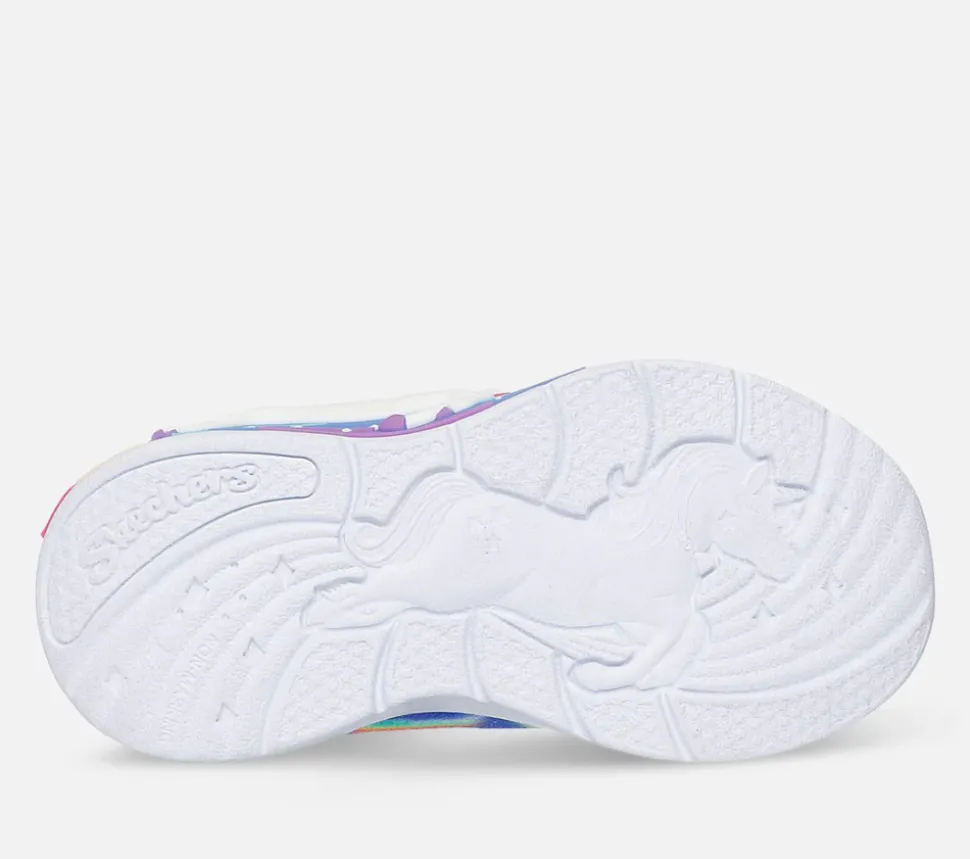 SKECHERS Unicorn Chaser er en livlig og farverig sko designet til børn, især piger, der elsker enhjørninger og alt, hvad der er fantasifuldt. Skoen har et iøjnefaldende udseende med en farverig palet, der ofte omfatter lyserød, lilla og blå nuancer. Enhjørningtemaet er tydeligt med enhjørninger på siderne af skoen. Glitter og skinnende detaljer er for at give skoen en ekstra magisk følelse