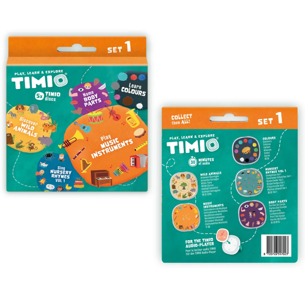 TIMIO Disc Set 1 inkluderer fem forskellige skiver: Vilde Dyr, 96 Børnerim Vol. 1, Farver, Musikinstrumenter og Kroppens Dele. Disse skiver er designet til at blive brugt som et udvidelsessæt til TIMIO, det interaktive lyd- og læringslegetøj. De smukt illustrerede skiver er magnetiske og kan nemt skiftes af et barn. Med quizzer og rigtige lyde til mere interaktion og lettere læring. Spilletid er ca. 30 minutter pr. sprog eller 240 minutter med alle sprog.