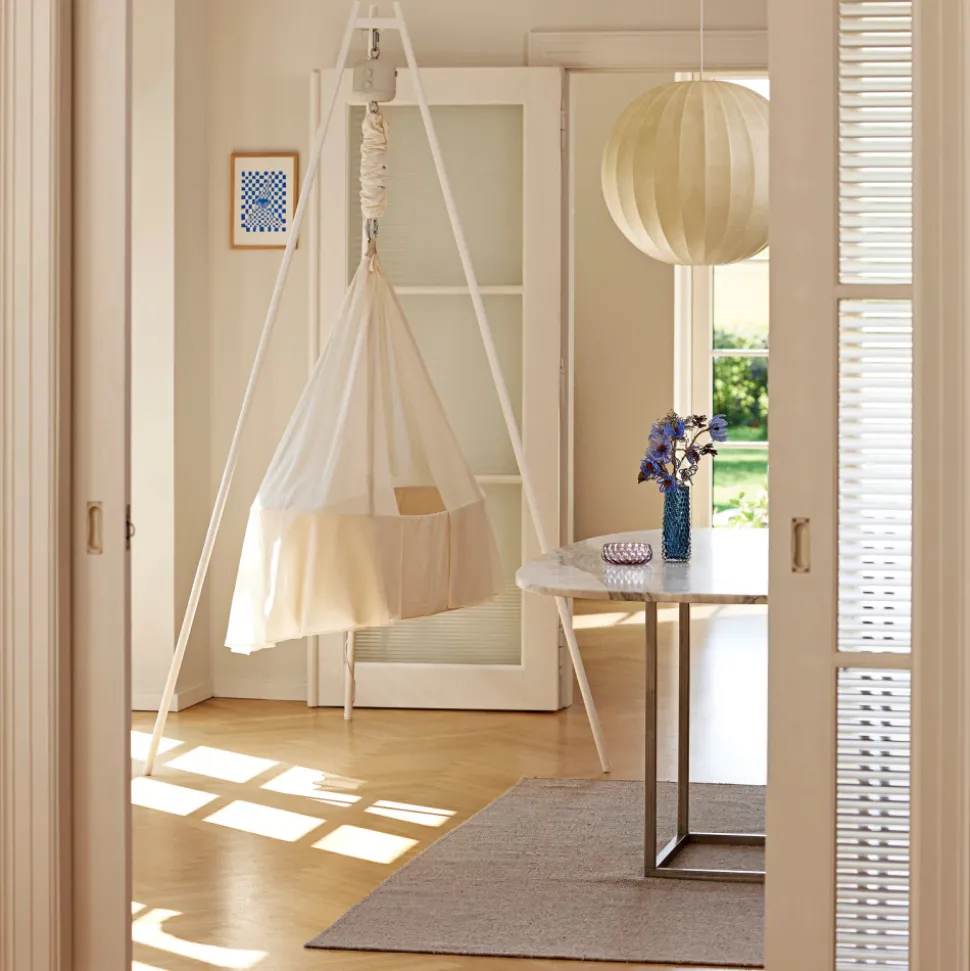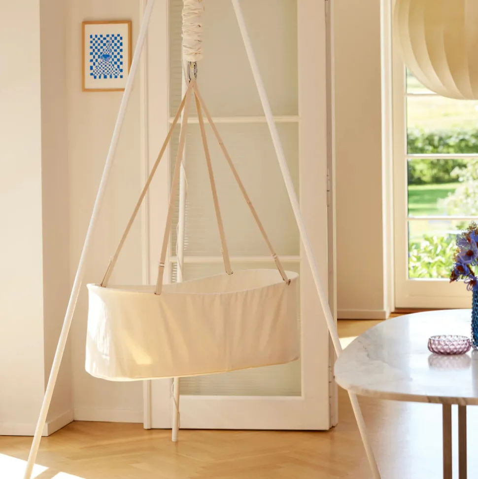 En hængende vugge til nyfødte og babyer, designet med fokus på komfort og sikkerhed. Den blide gyngende bevægelse beroliger urolige babyer og fremmer en rolig søvn. Membantus vugge sørger for blide, beroligende vuggebevægelser – hjælper din baby med at falde til ro og sove bedre.