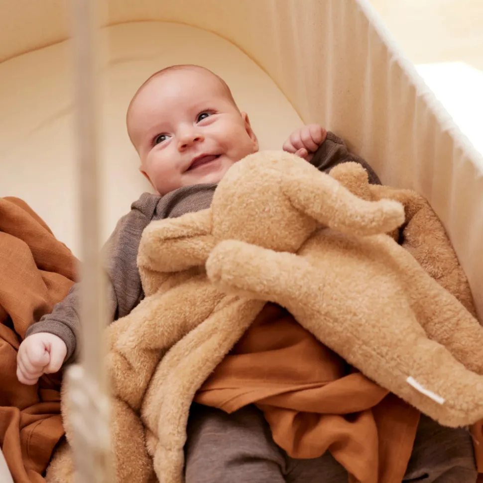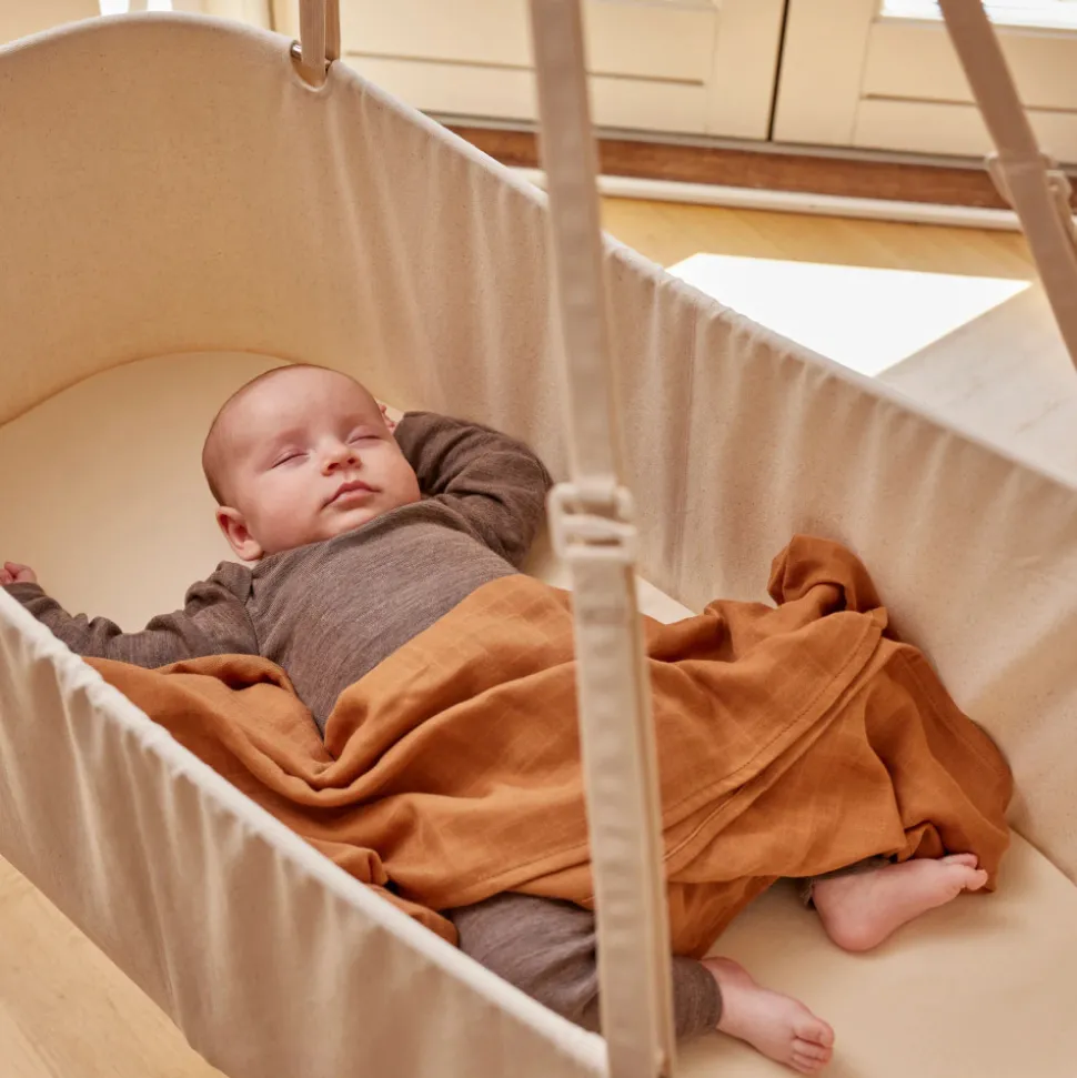 Vuggen adskiller sig fra deres slyngevugger ved at have en flad og mere rummelig liggeflade, der giver dit barn ekstra plads til at vokse og bevæge sig frit. Vuggen er fremstillet af blød, økologisk bomuld og leveres med en fast, åndbar skummadras, som skaber et behageligt og trygt sovemiljø for din baby. Til forældre, der ønsker en naturlig og beroligende soveløsning, der fremmer både komfort og søvn.
