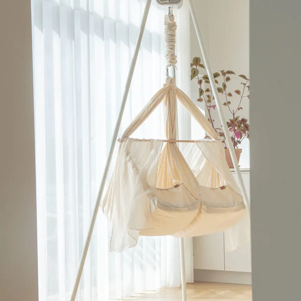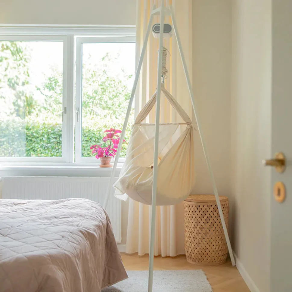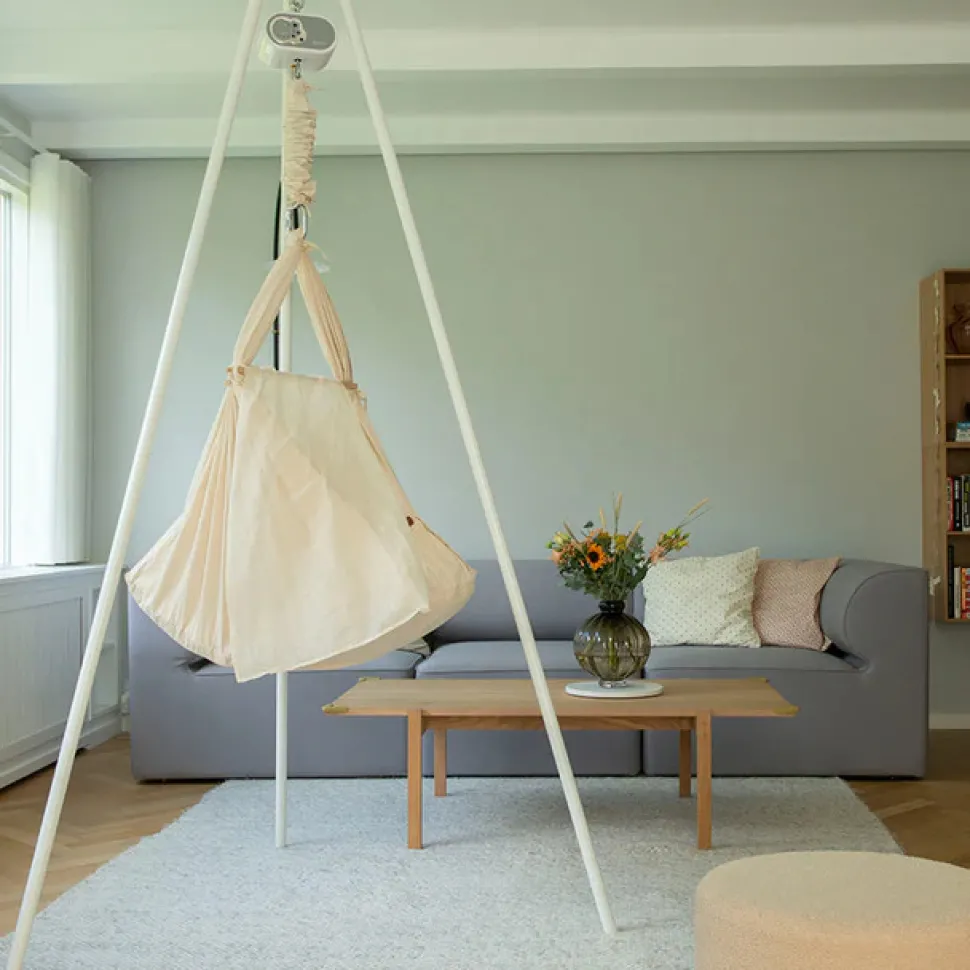 Membantu vuggestativ, er enkelt i sit design og kan passe ind i de flestes hjem. Med et vuggestativ kan du sætte din slyngevugge op alle steder. Stativet kan flyttes rundt og samles uden brug af værktøj, alt efter hvor de voksne befinder sig i hjemmet, og det er let at montere både slyngevuggen og motoren i toppen. Højde: 216 cm. Gulvareal: 125 cm.