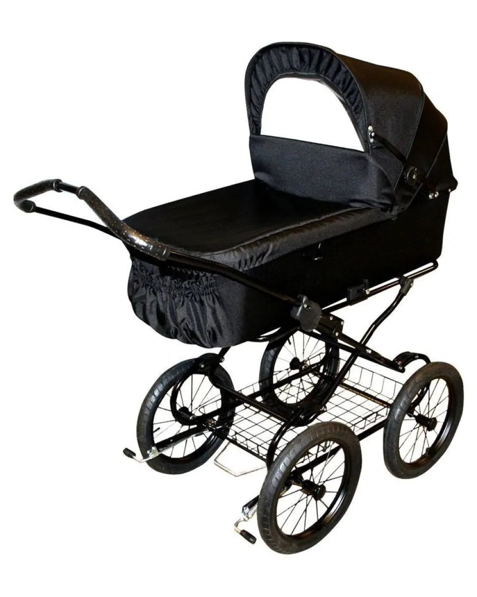 Helt klassiskVognen har et meget klassisk udseende med fast kaleche, og forlæderet monteres med trykknapper. Overdelen er sort og praktisk, og stoffet er imprægneret fra fabrikken af. Udvendigt i fodenden er der en lille lomme, så der lige er plads til en babyalarm eller måske en sut.