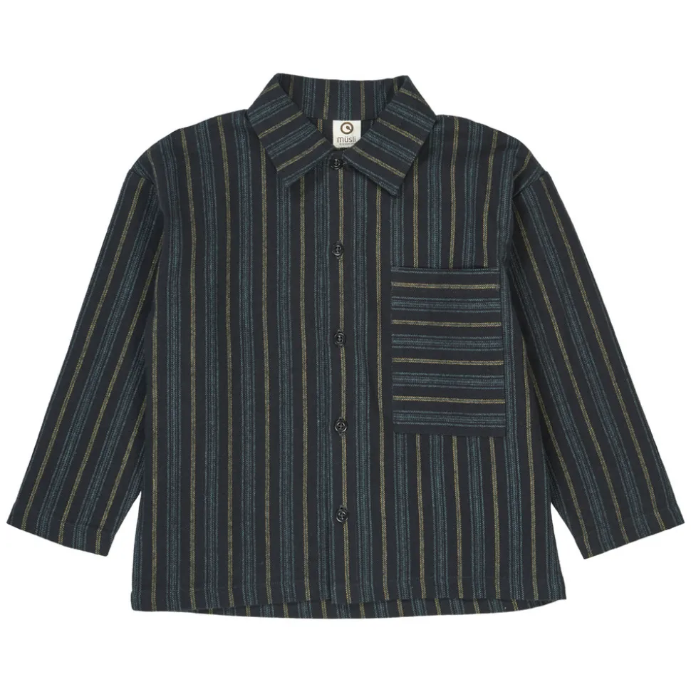 En smart og tidløs skjorte med flotte striber i blå og grønne nuancer, der giver et friskt og stilrent udtryk. Skjorten har et klassisk design med krave, gennemgående knaplukning og en stor, firkantet brystlomme, som tilføjer et moderne twist.