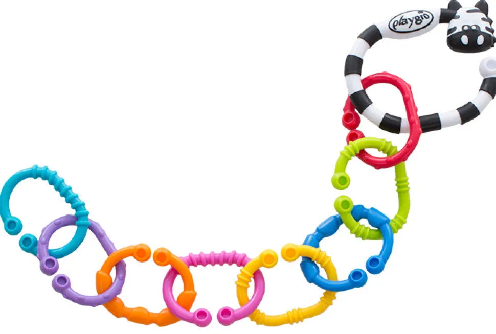Den fine zebra holder styr på de 8 kædeled. Brug leddene til at hænge babylegetøj med på f.eks. barnevognen. Eller sæt dem sammen til en lang kæde. Både led og zebra fra Playgro kan være dejlig at bide i, når gummerne klør. Fra 0 måneder.